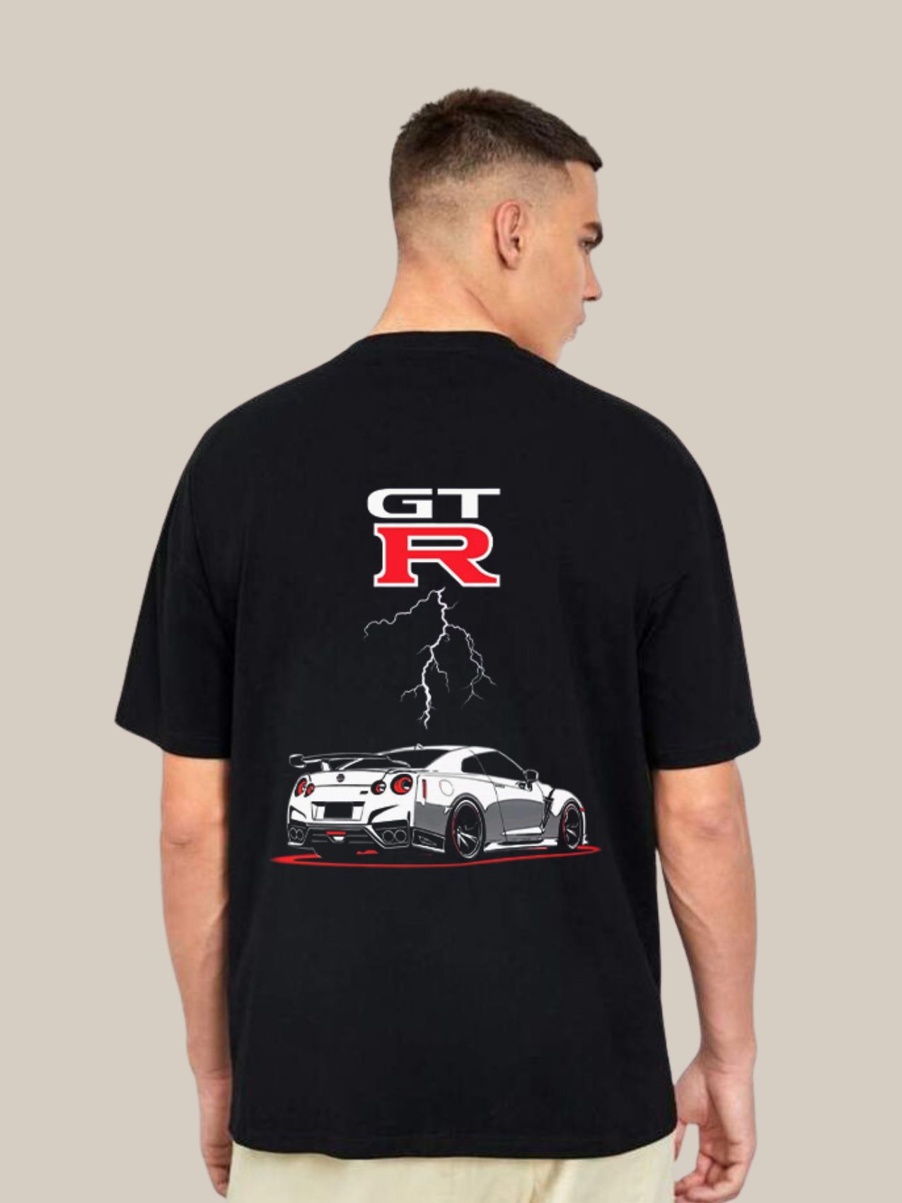 Fuel your style with the GT-R Lightning Speed Tee, designed for speed lovers and streetwear enthusiasts. This premium oversized black t-shirt features a powerful rear-view illustration of the iconic GT-R car, accented with bold lightning detailing and the GT-R logo for maximum visual impact.