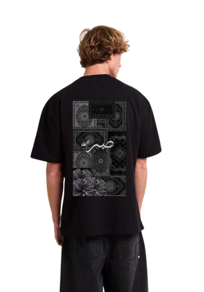 Men’s Oversized Black T-Shirt with Patchwork Bandana & Floral Back Print | Streetwear Cotton Tee