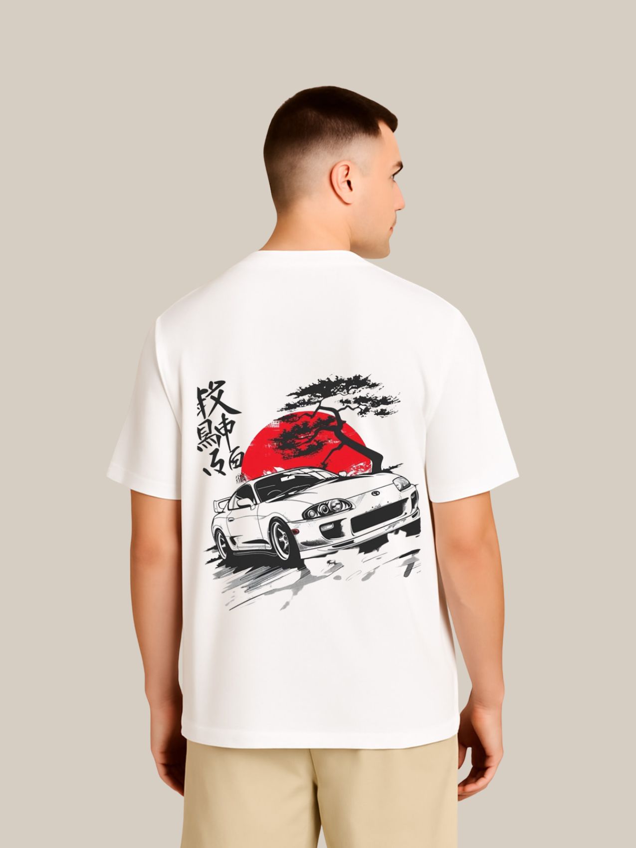 Hit the streets in style with the Tokyo Drift Legend Tee – a must-have for JDM fans and streetwear enthusiasts. This clean white oversized t-shirt features a dynamic rear graphic of the iconic Toyota Supra, drifting into the spotlight with a bold red sun and Japanese brush art elements.